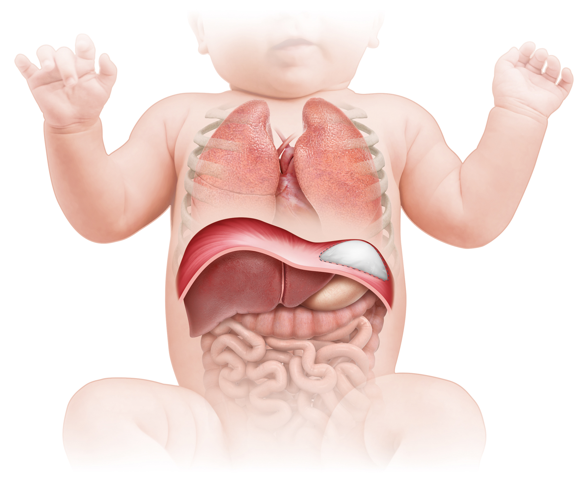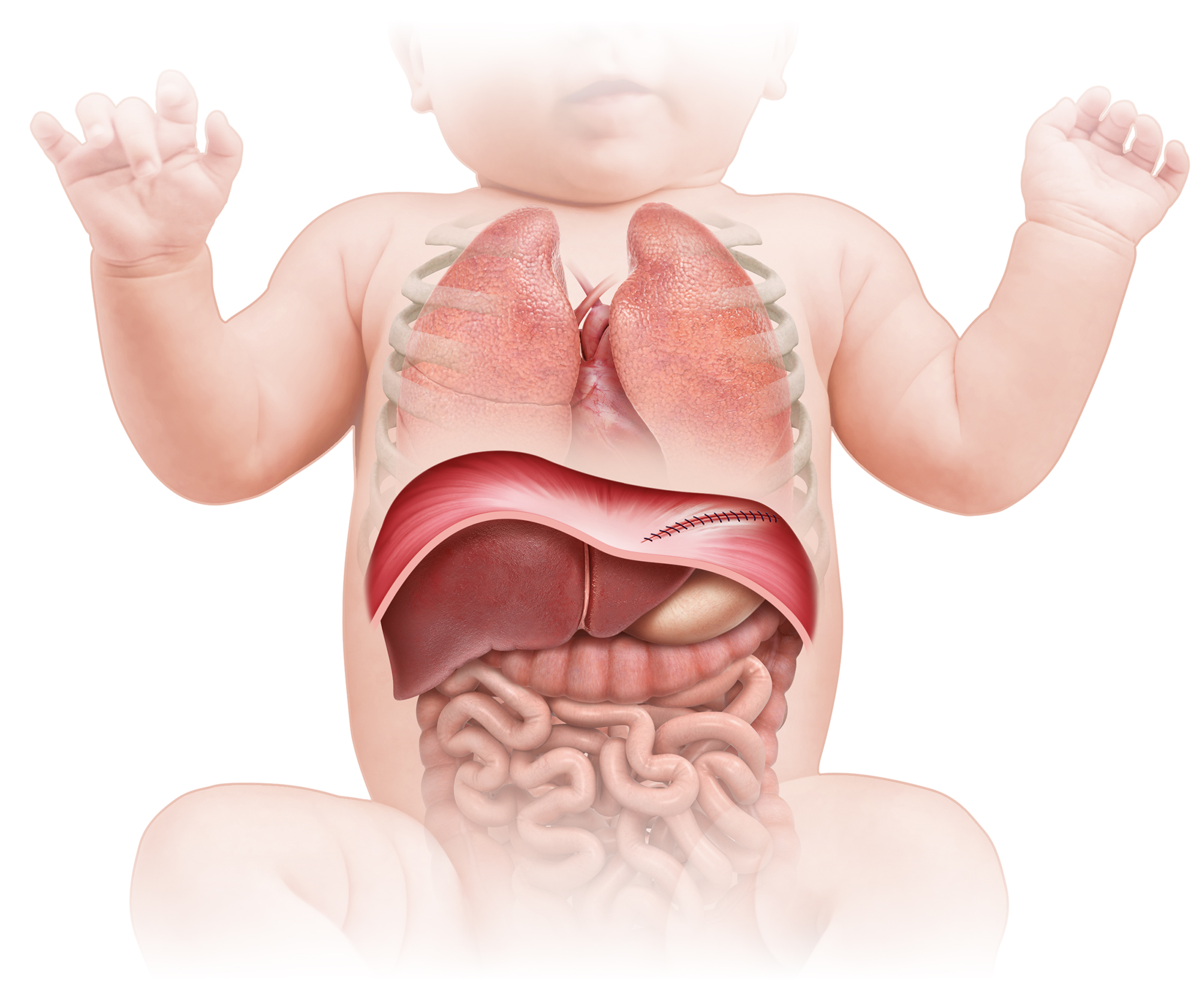 Once stable, your baby’s condition will be assessed by a team of neonatologists and surgeons to determine if hernia repair surgery can be performed. If there are large defects in the diaphragm, it is necessary to repair the diaphragm by placing a synthetic mesh. For smaller holes, it is possible to repair the diaphragm by stitching it back together. The type of surgery is chosen by the surgeon during the operation.